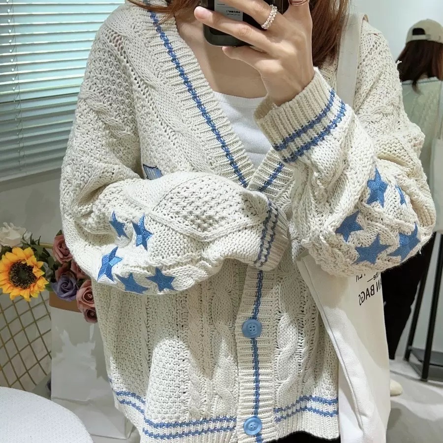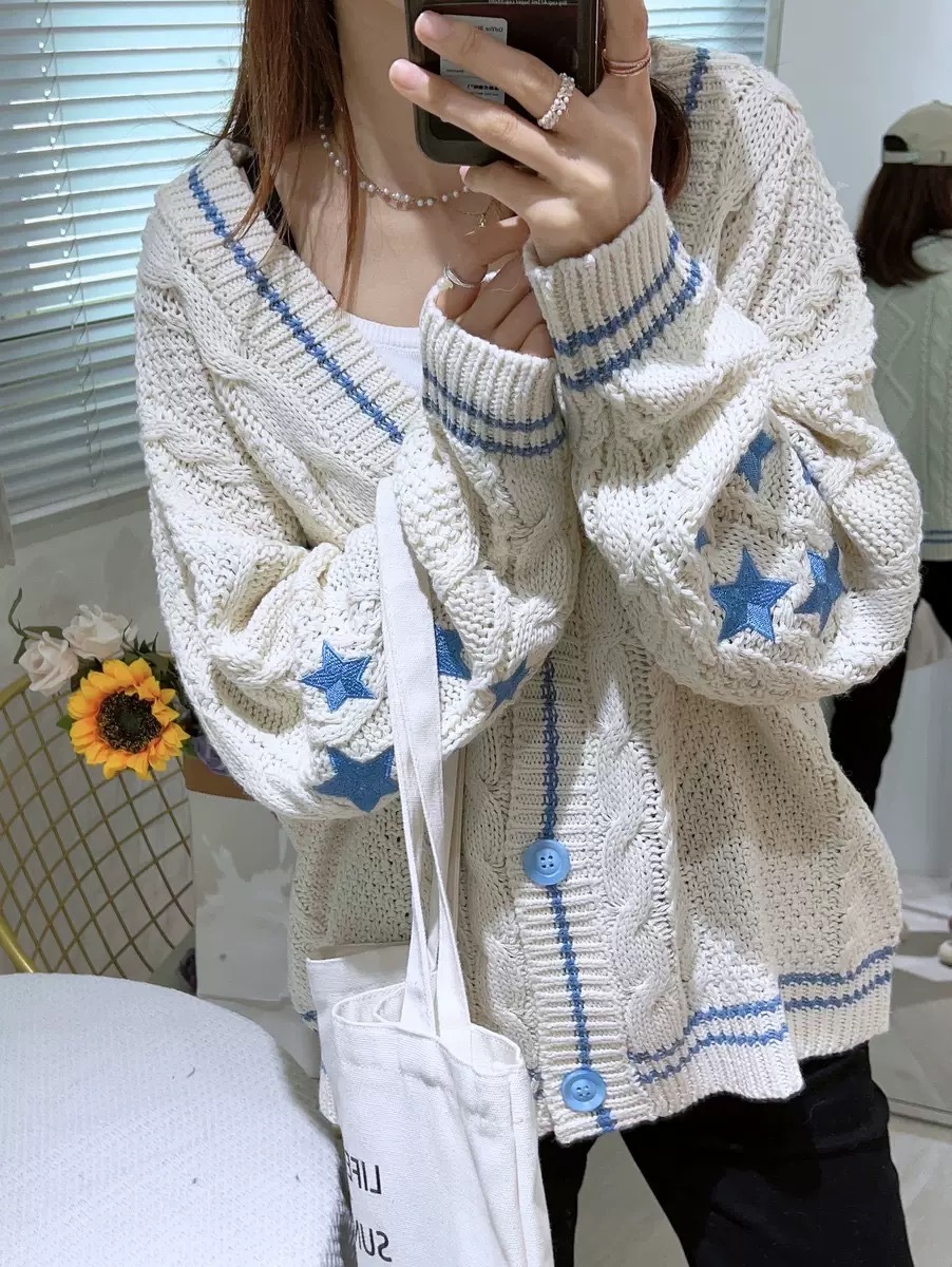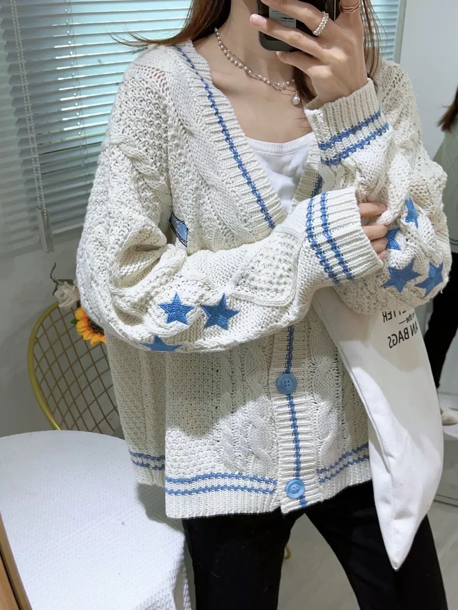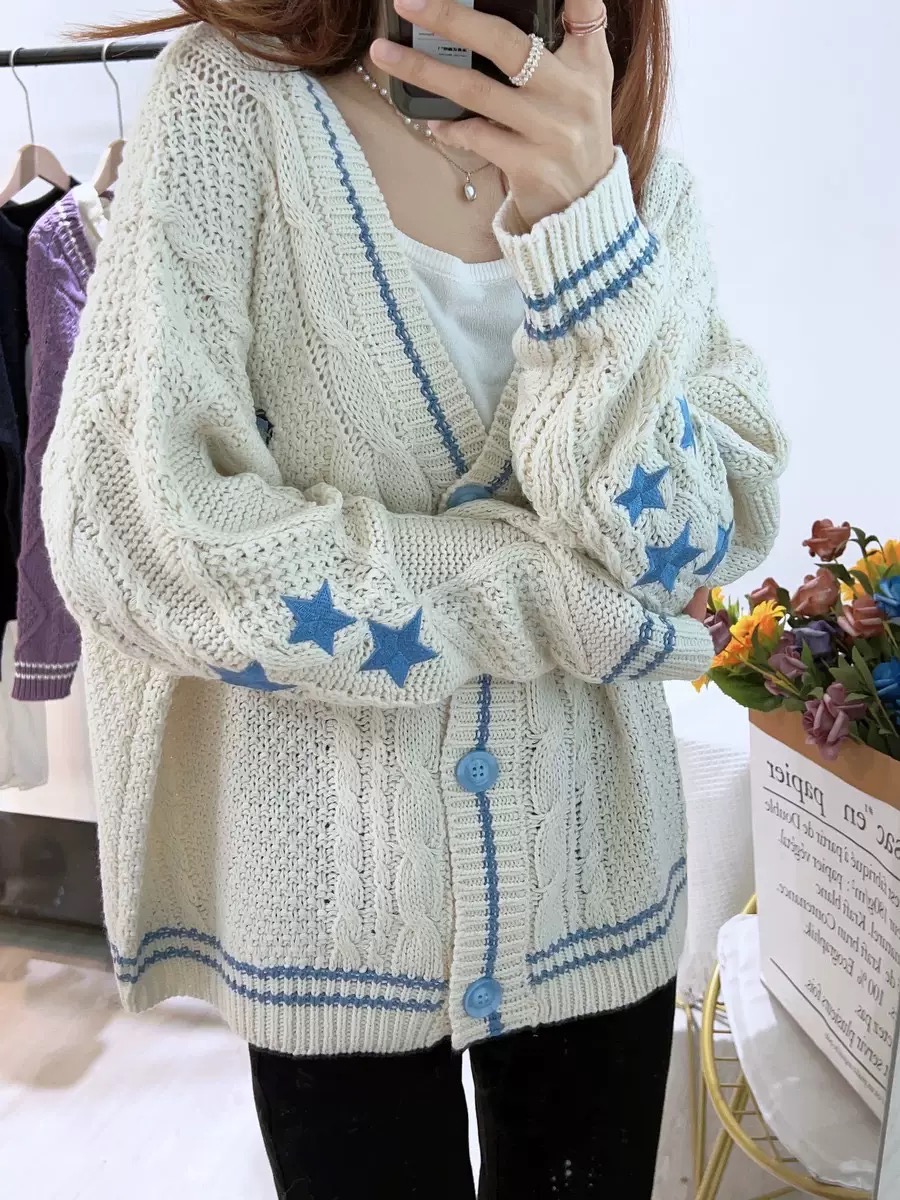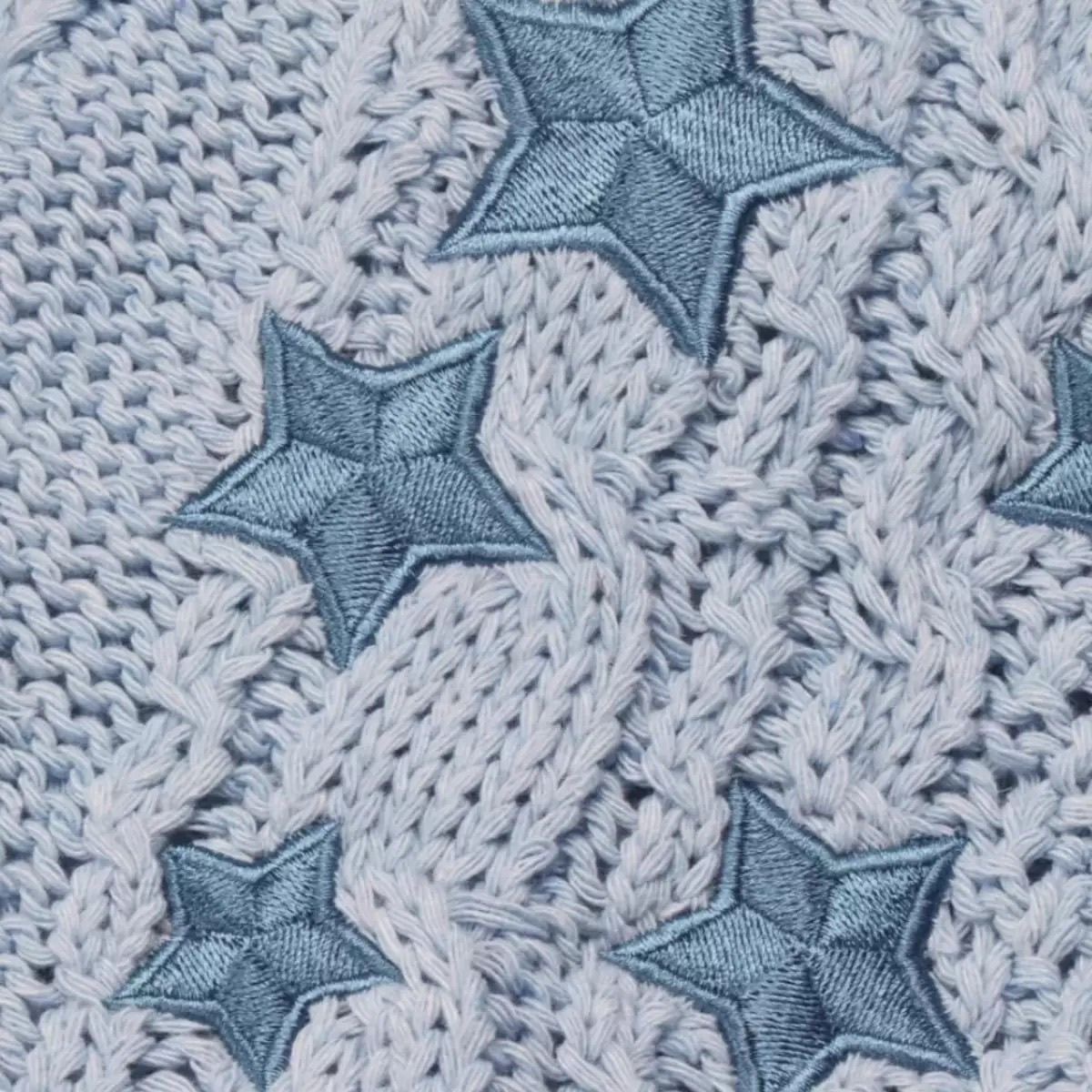 Inspired by the re-recording that defined a pop generation, this cable-knit cardigan features a V-neckline, tortoise-shell style buttons (color-matched), and heavy embroidery. The sleeves are adorned with five-point stars, reminiscent of the seagulls flying over the beach on the album cover. Finished with a “1989 Taylor’s Version” woven patch on the chest.