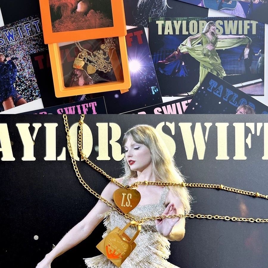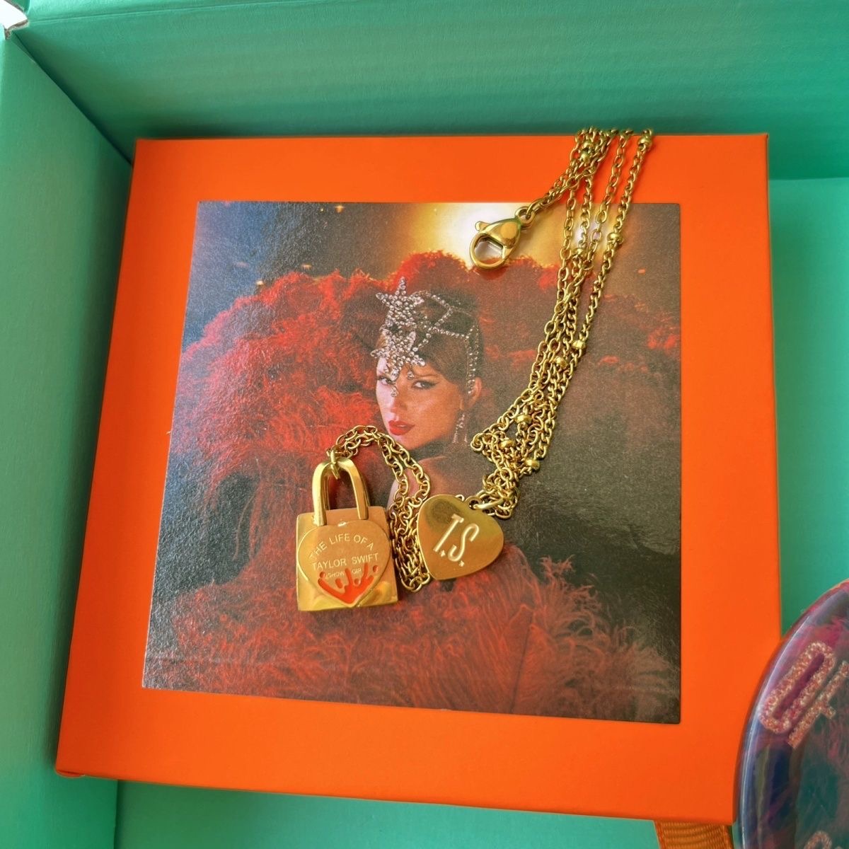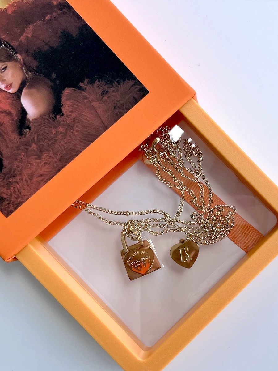 The shorter layer showcases a delicate heart charm engraved with “T.S.”, while the longer layer features a detailed padlock pendant inscribed with “The Life of a Taylor Swift Showgirl.” Each order is packaged in a premium orange gift box, making it a perfect collector’s item or a ready-to-give gift for any Swiftie.