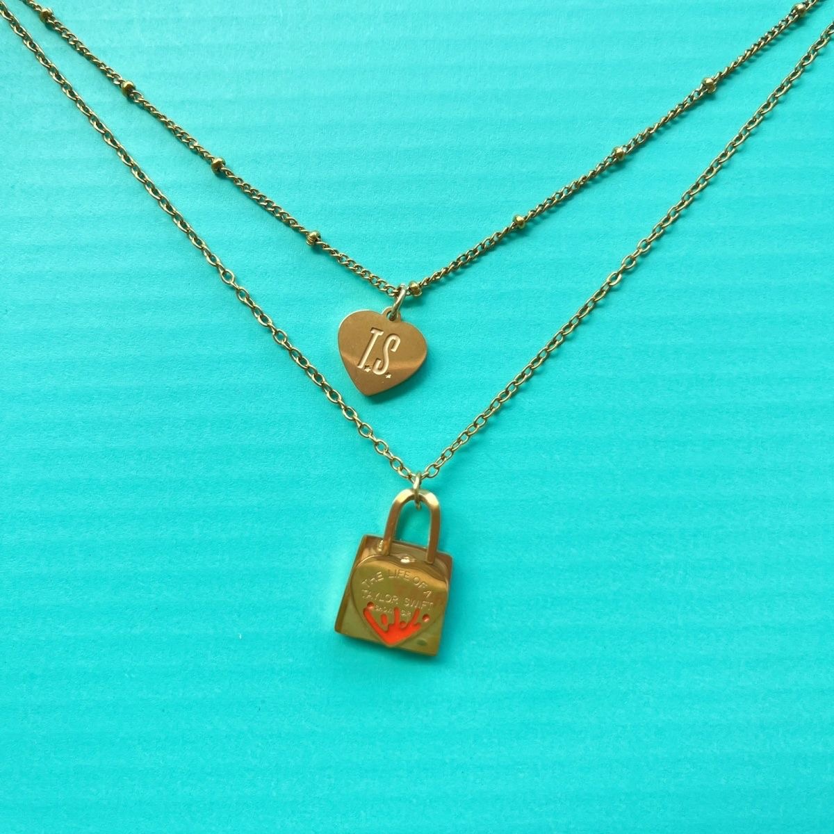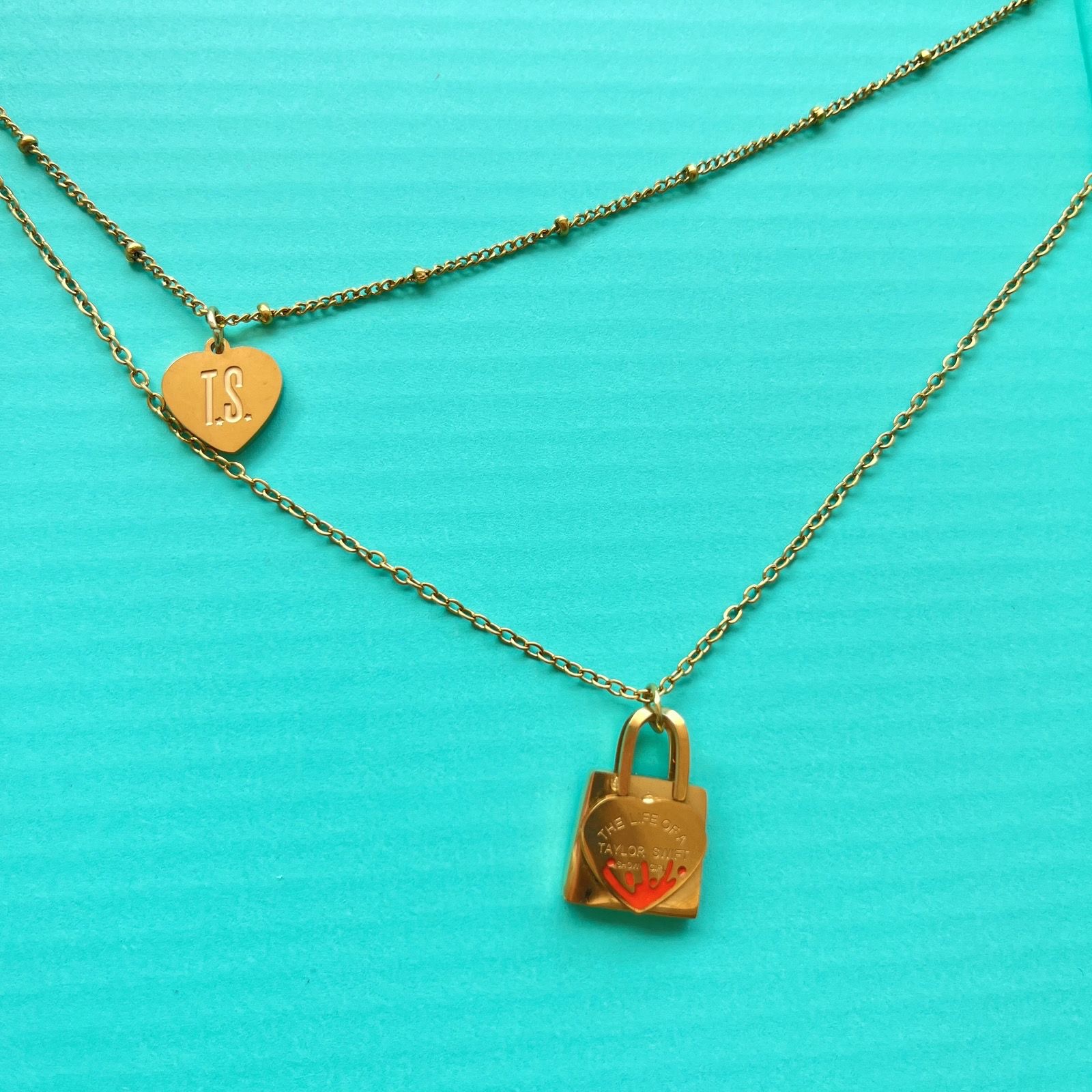 Embrace your inner showgirl with this stunning double-layered necklace inspired by Taylor Swift. Featuring a “T.S.” heart and a signature padlock charm, this 18k gold-plated set comes pre-styled for a perfect layered look and includes a signature orange gift box.