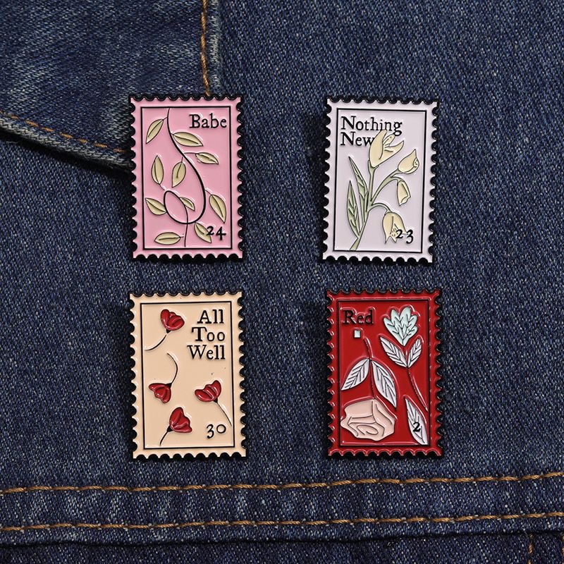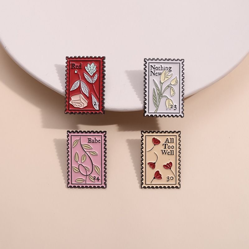 ✨ Channel your Swiftie vibes with these Red Album-inspired stamp enamel pins! Featuring 4 floral designs from “All Too Well,” “Nothing New,” “Babe,” and “Red.”