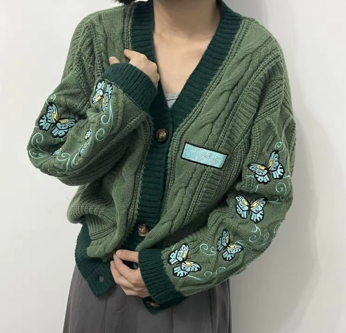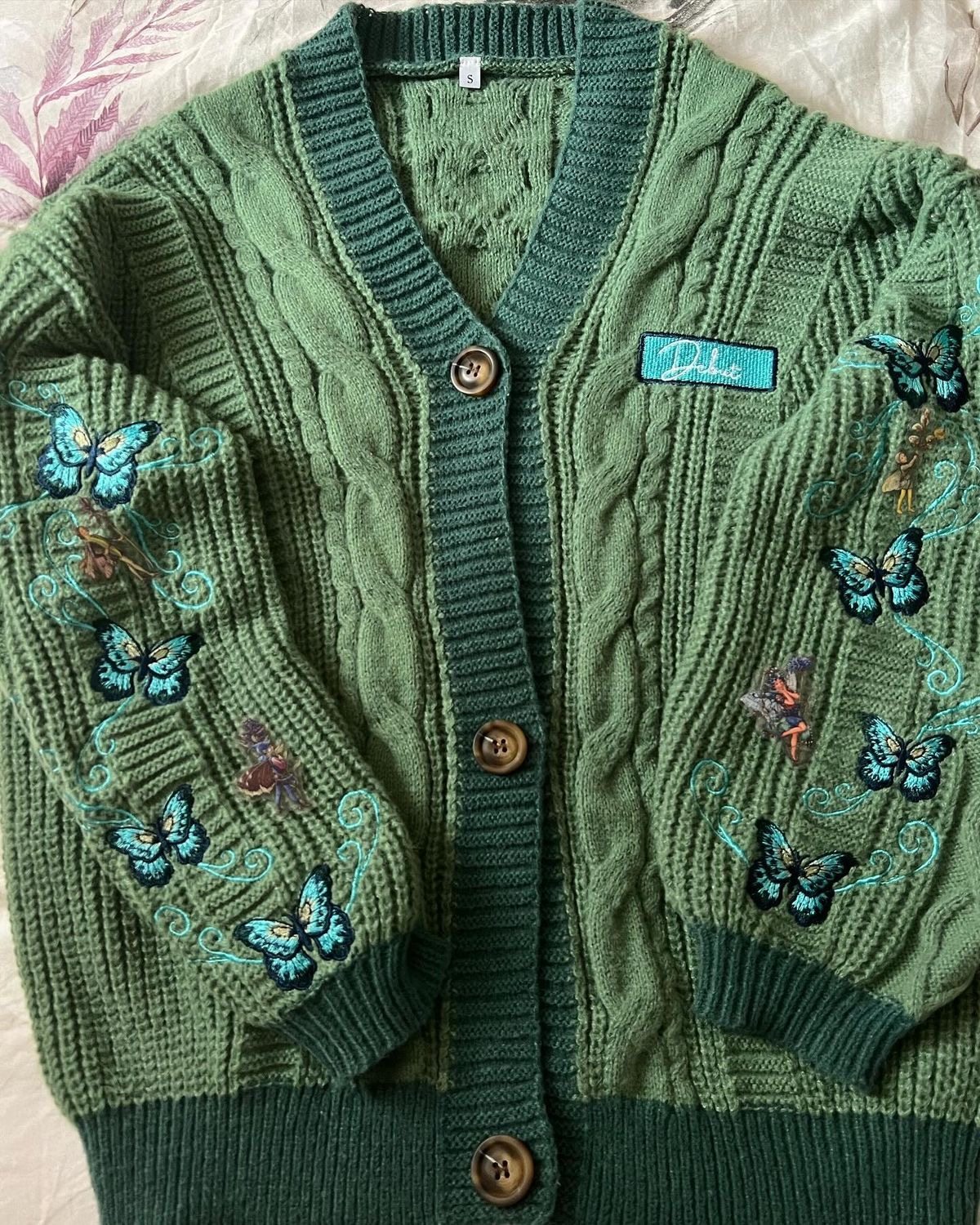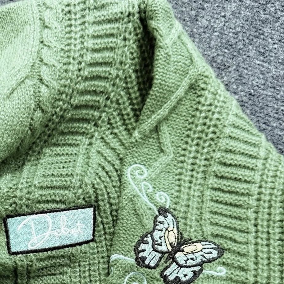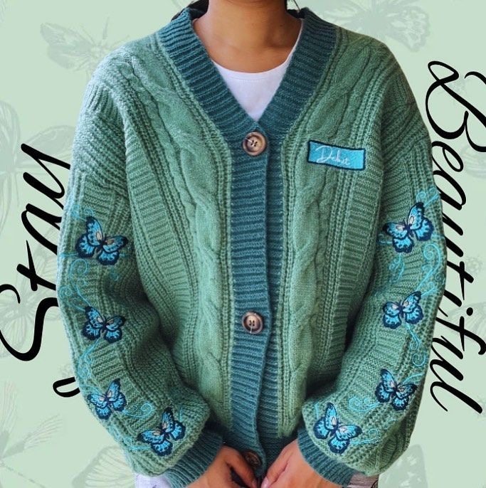 Return to where the magic began with our Debut Butterfly Cardigan. Featuring vibrant turquoise butterfly embroidery and a custom “Debut” patch, this lush green cable-knit sweater captures the country-core aesthetic of Taylor’s first era. Crafted from premium 100% polyester for ultimate comfort.