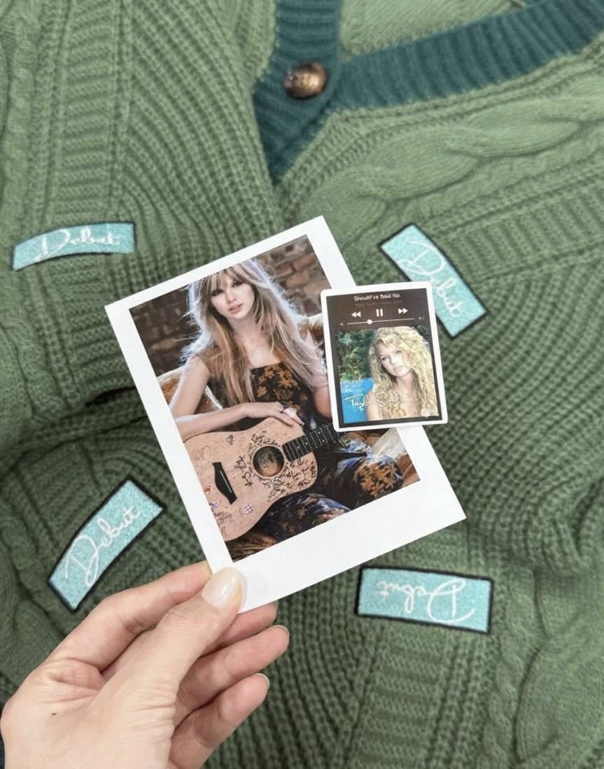 The cardigan is designed in a beautiful forest green with dark contrast ribbing and vintage-style buttons. With a special “Debut” patch on the chest, it’s the perfect way to celebrate Taylor Swift (Taylor’s Version). Whether you’re strumming a guitar or dreaming under the stars, this heavy-knit cardigan brings those early 2006 vibes into your modern wardrobe.