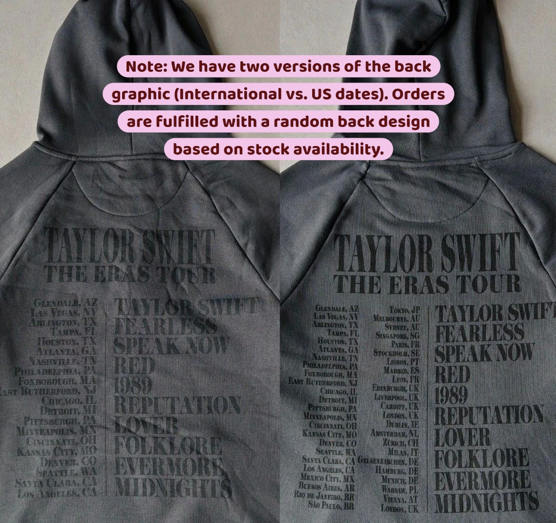 Stay “Enchanted” and warm this winter in our The Eras Tour Charcoal Grey Fleece Hoodie. Featuring the iconic collage of Taylor’s eras on the front and a comprehensive list of tour dates on the back, this high-quality hoodie is the perfect way to commemorate the tour of a lifetime. Made from a premium cotton blend with a soft fleece lining.